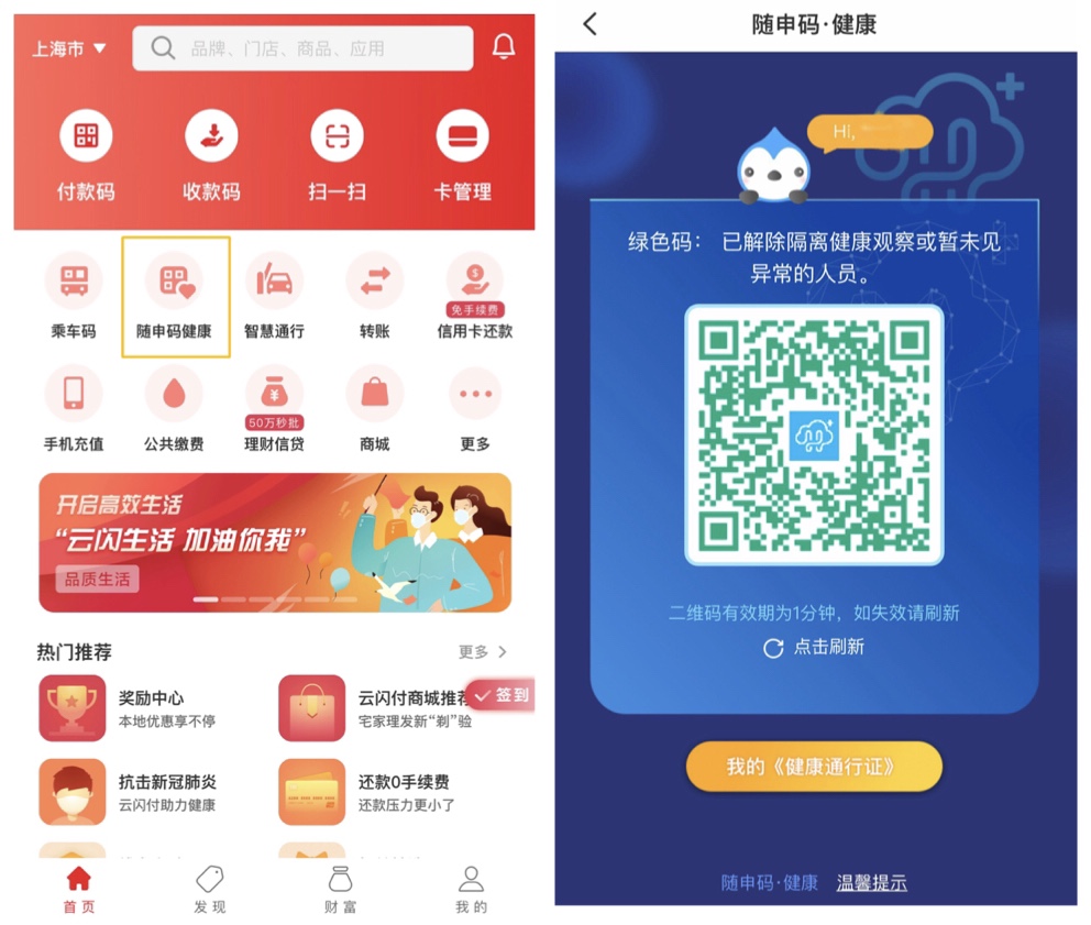 中国银联与上海相关部门积极联动,推动云闪付APP和上海健康云合作,3月5日下午,云闪付APP内上线上海“随申码•健康”和入沪人员健康登记服务。“随申码•健康”是以上海市民、返工返岗人员及待入沪人员自行申报数据为基础,结合防疫信息比对校验后生成的个人专属二维码。用户在云闪付APP首页进入“随申码•健康”服务,绑定个人信息,生成二维码,即可作为个人健康信息的电子通行证;只需填报一次,便可全市通用。