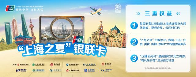 持卡人在上海地区指定商户使用“上海之夏”主题借记卡每周累计消费达标,即可获得抽奖机会,奖品涵盖上海文旅特色与生活服务等产品,让文旅权益与生活福利为消费赋能。同时,消费季精心打造“上海之旅”特色活动,规划“海派、锦行、悦住、乐食、享购、趣玩”六大主题消费路线,覆盖旅游、出行、住宿、餐饮、购物、娱乐等九大核心消费场景,持卡人可便捷享受遍布全城的支付立减优惠。上述两项活动可登录云闪付APP,在“U惠魔都”版块进入“上海之夏卡”和“上海之旅”查看具体活动细则和商户。除此之外,持卡人还可叠加享受银联“玩赚云闪付”、“有礼乐开花”等基础权益,通过“小额高频+大额惊喜”,银联将不断为持卡人送上消费福利。