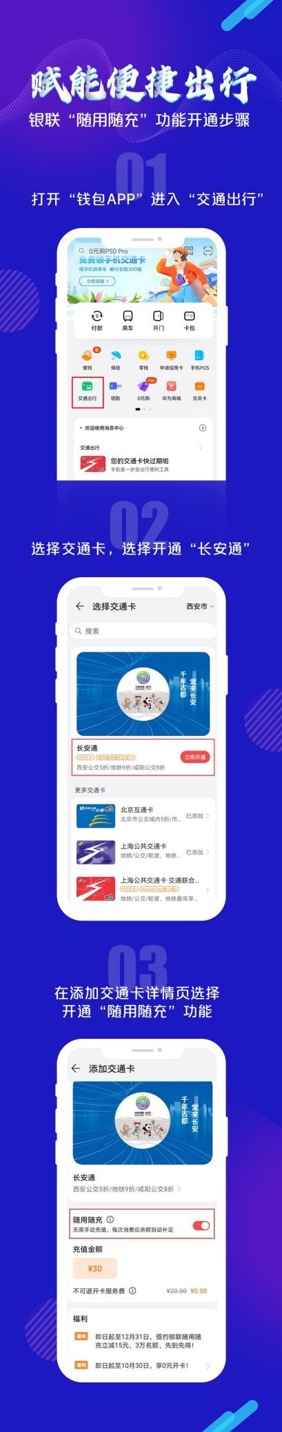 近日,银联手机闪付“随用随充”功能在西安“长安通”交通卡正式开通,助力便捷出行,为用户美好生活赋能。华为及荣耀手机机主可在“钱包APP”内“交通出行”板块完成“长安通”新卡开通,已开通用户可在“添加交通卡”详情页选择开启“随用随充”功能,开通新卡的用户可享“充值立减15元”及“0元开卡”优惠。