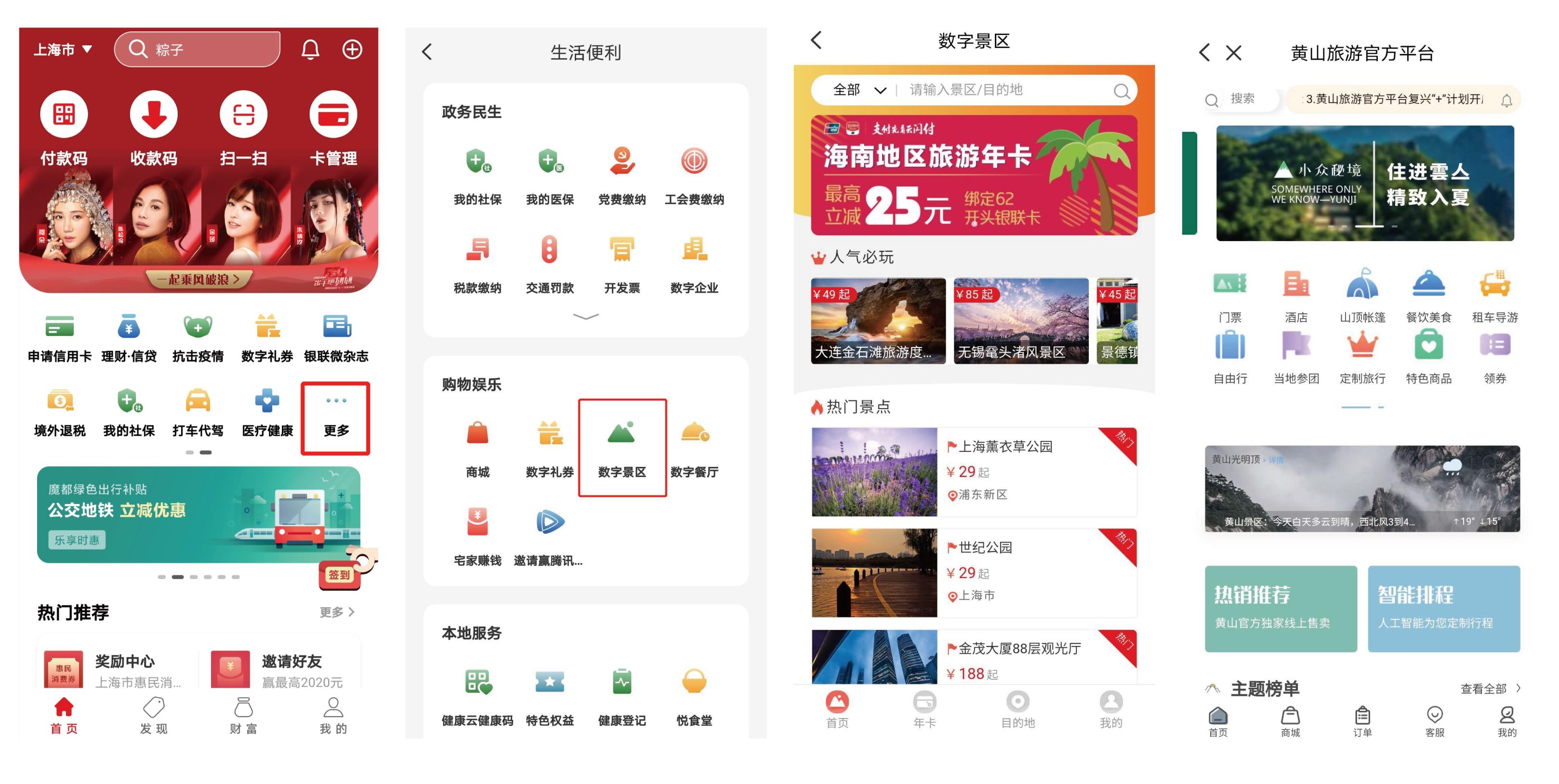 本次服务升级,在“数字景区”原有的景区购票、年卡购买等功能的基础上,新增景区实名预约等功能,以适应防疫出游需要,满足景区分流需求,保障游客顺利入园、安全游览。同时,“数字景区”的应用场景更为丰富,全新推出“旅游目的地”应用,提升旅游景区数字化服务水平。目前,黄山成为国内首家入驻的旅游目的地,用户在云闪付APP首页点击“更多”进入“数字景区”频道,在“目的地”板块中可享受黄山景区全方位官方旅游服务,包括旅行须知、攻略锦囊、分时预约、门票购买、年卡购买、特色商品预购、扫码过闸、租车导游和定制旅行等,实现“食、住、行、游、购、娱”等旅游综合一站式服务集成,方便广大游客轻松游览黄山胜景。